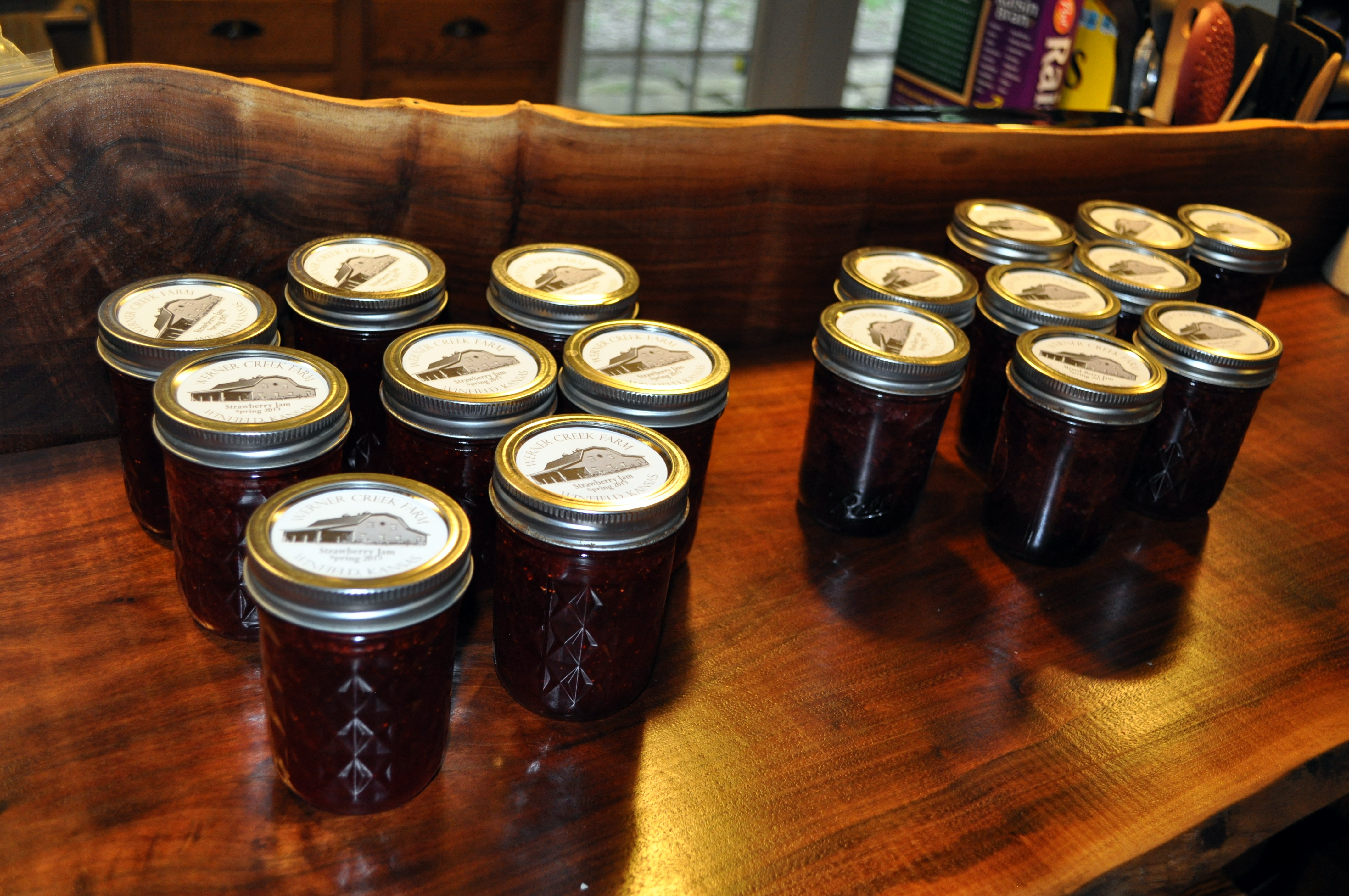Homemade strawberry and mixed-berry jam. We only use berries from our farm! These were picked last spring and frozen to allow me to make jam when things are not quite so busy! The mixed-berry jam has strawberries, blackberries, and raspberries, and is delicious.