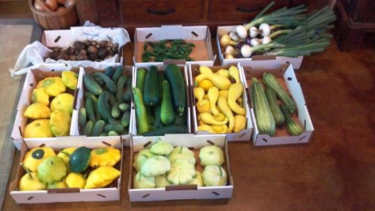 Yellow squash, zucchini, three types of pattypan squash, cucumbers, onions, and a few new potatoes and jalapenos. Still no tomatoes yes, but SOON. We also still have a FEW thornless blackberry plants left. If you want them, make sure to come early! We will also still be selling pecans.