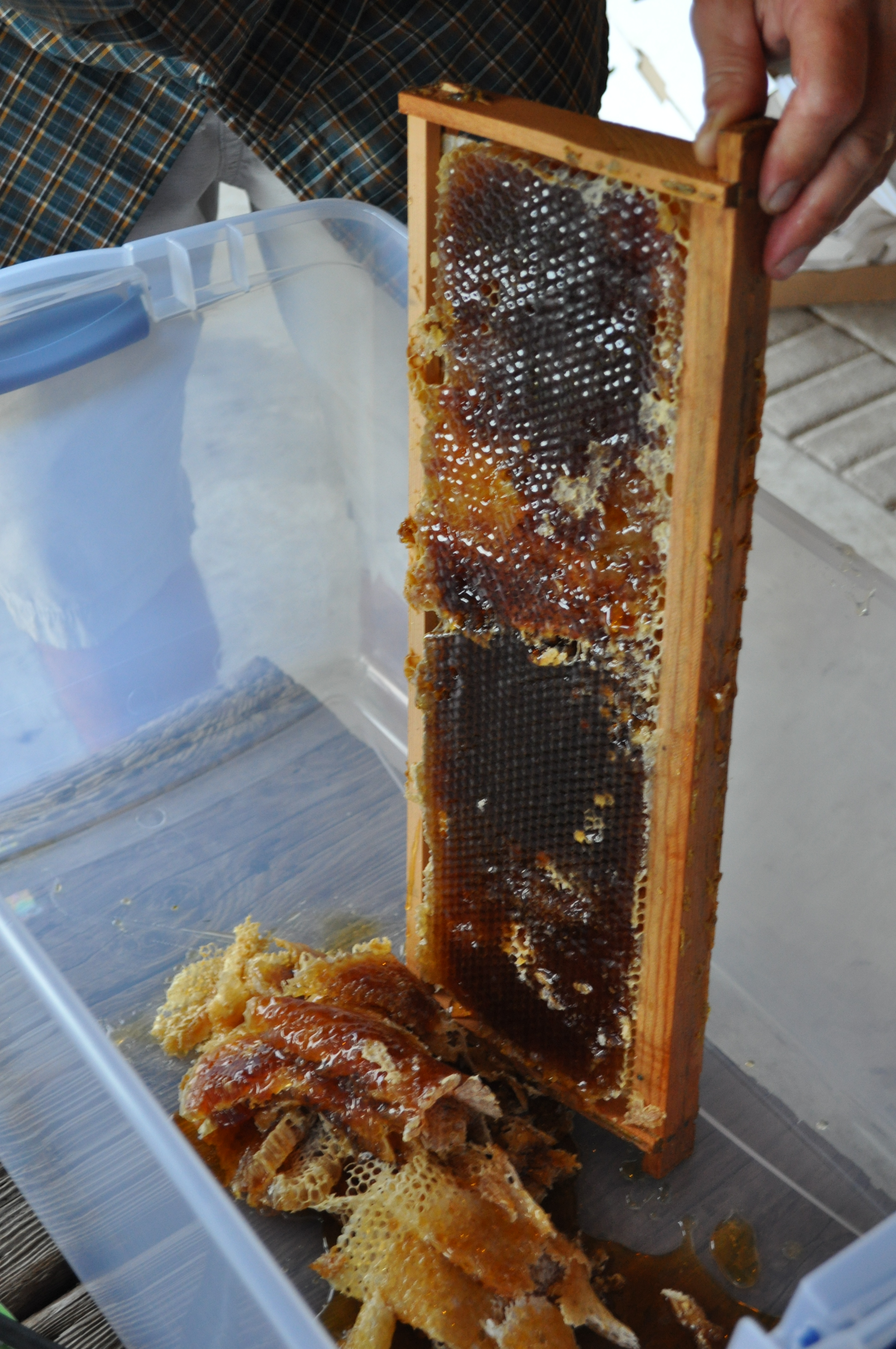 Our bees are doing quite well. Wwe weren’t supposed to be able to harvest any honey from our bees this year, since we split our one hive into multiple hives this spring. But apparently it was a good year for honey. Gage recently harvested around 200 pounds of honey from our 10 hives (really from just nine of the ten, as we just acquired one, so there is no honey on that one yet).