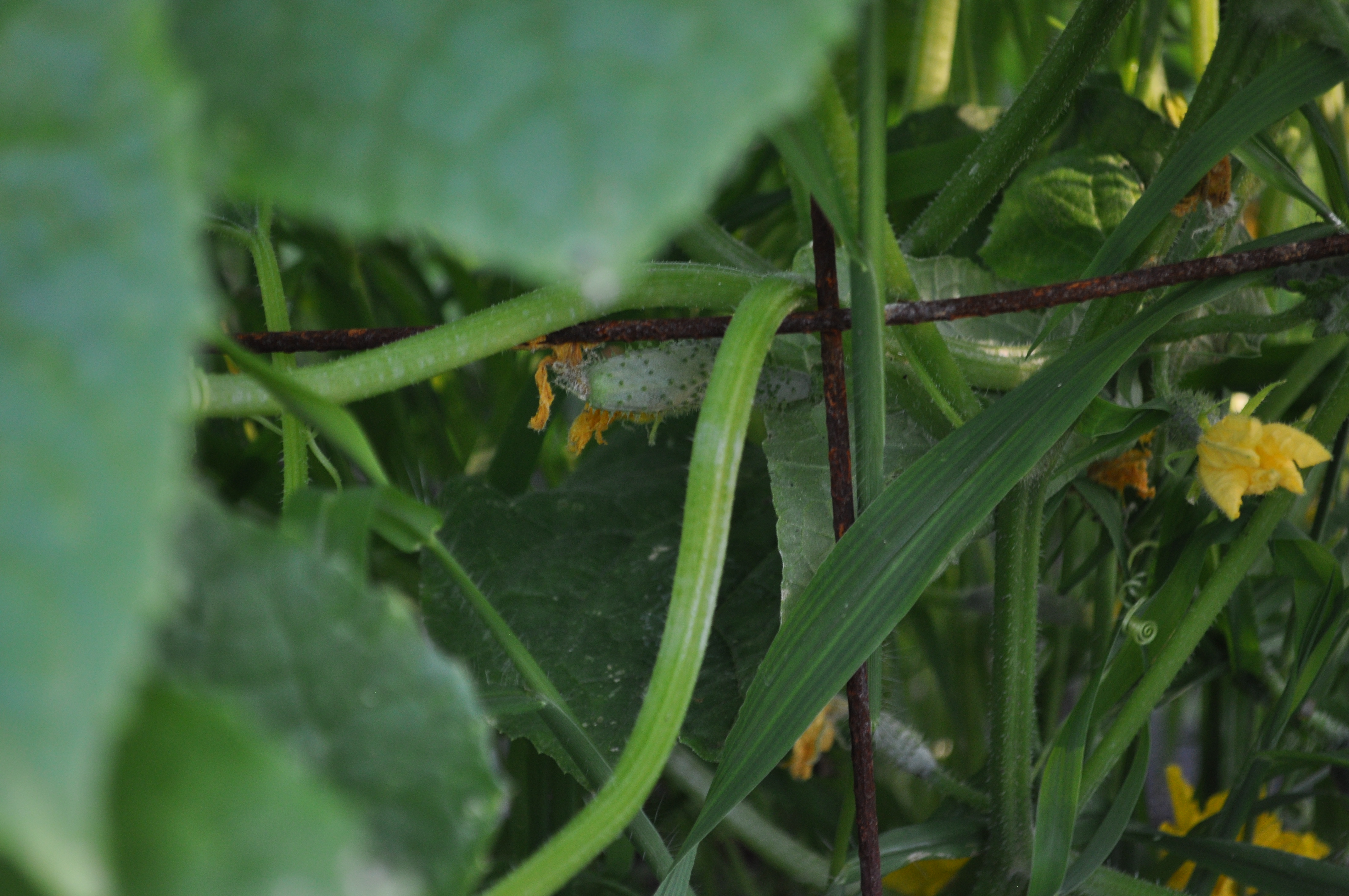 Gage says there are a few cucumbers ready, too, but I am skeptical. You almost have to squint to see them here.