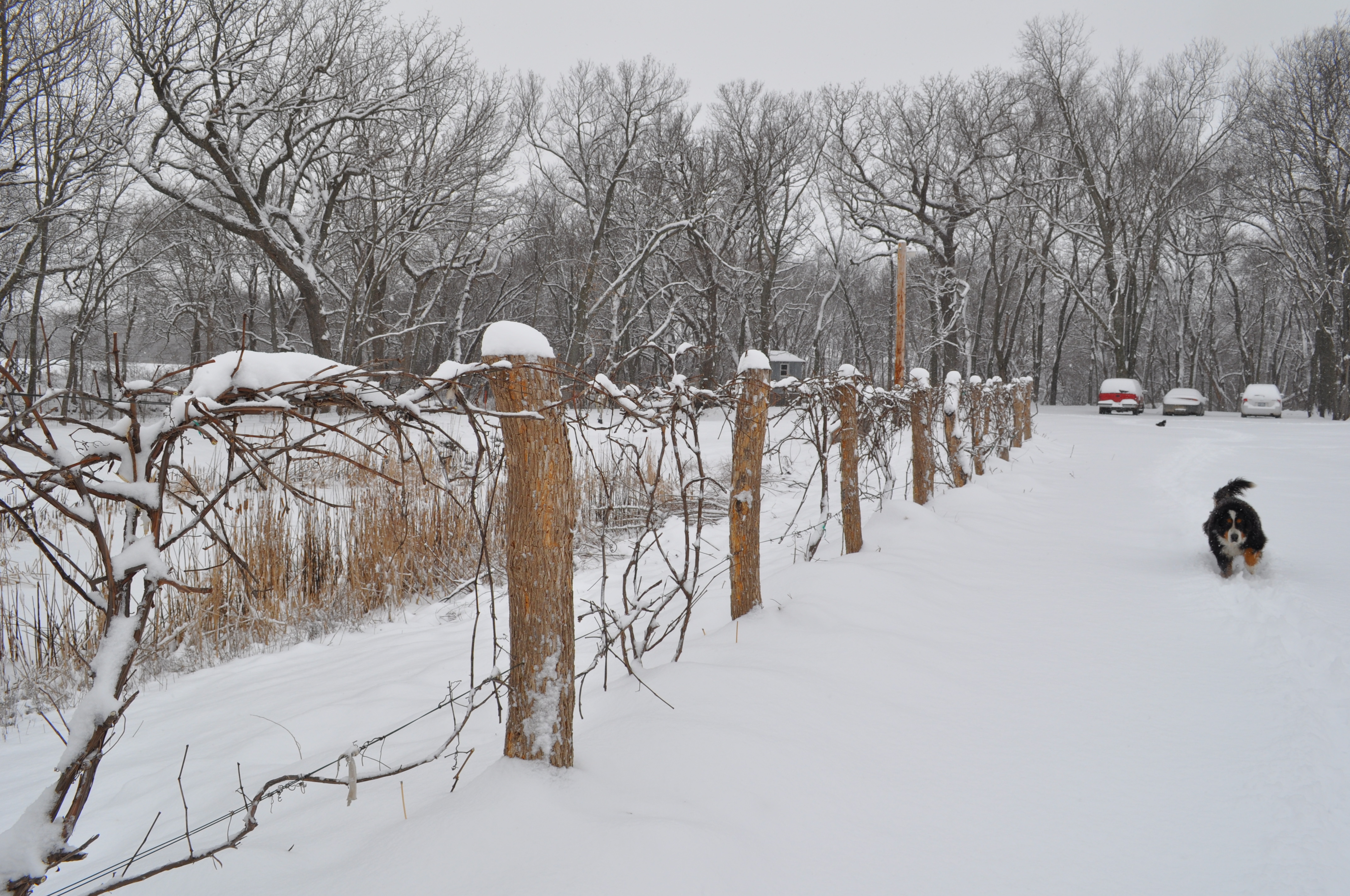 The grapvines, all pruned and ready for the season, still sleeping beneath a layer of snow. Old Koda trudging through the snow.