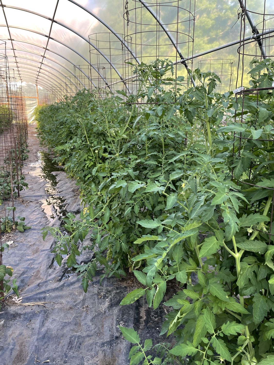 The tomato plants in our high tunnels look wonderful and are loaded with green tomatoes. We should have enough ripening to bring to farmers markets by late June.