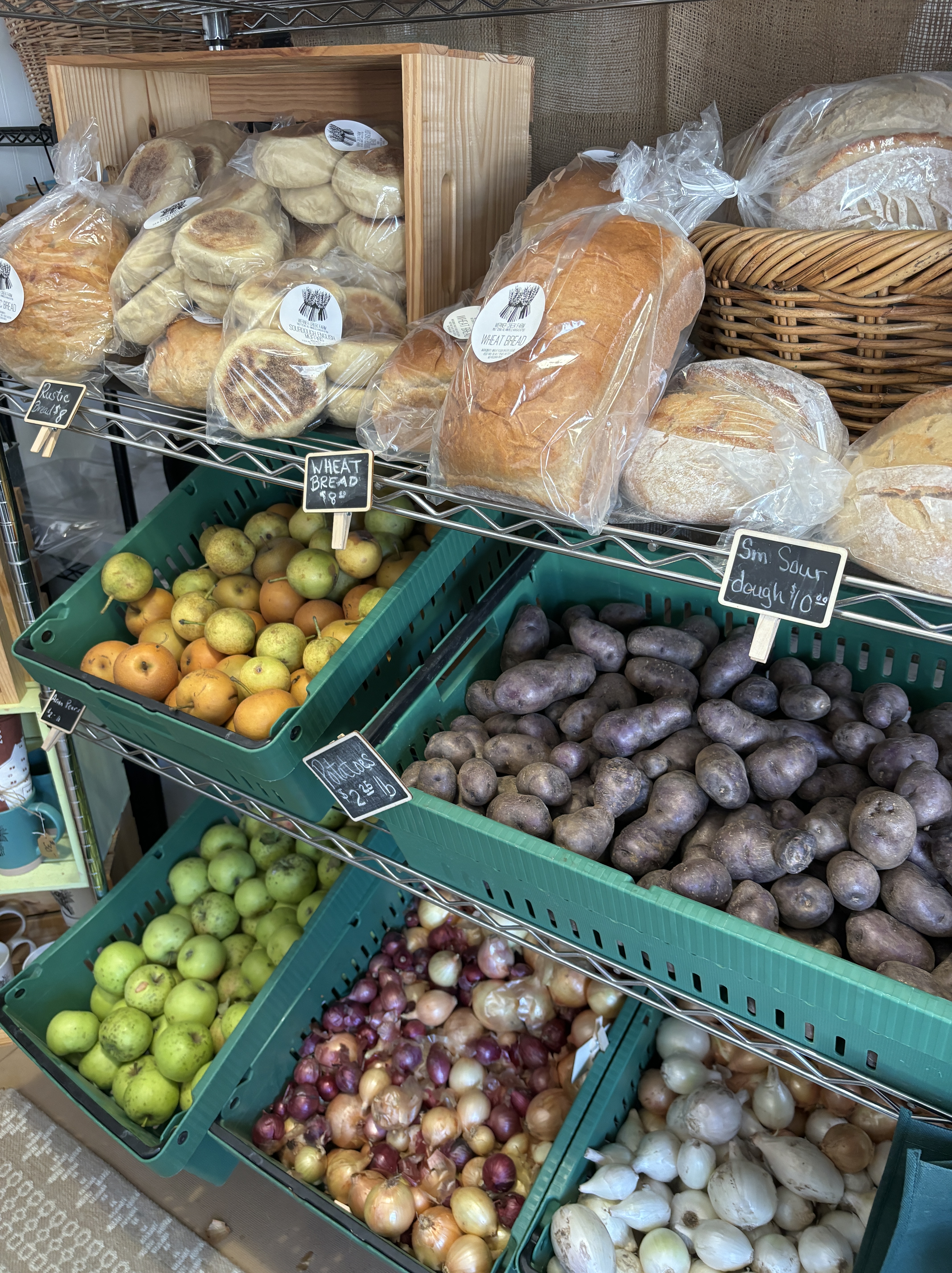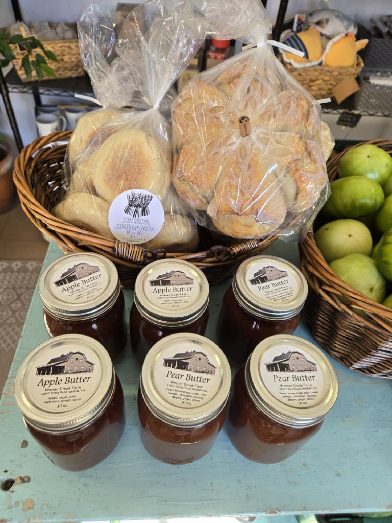 - Fresh sourdough, wheat and rustic breads, pies, cinnamon rolls, and English Muffins